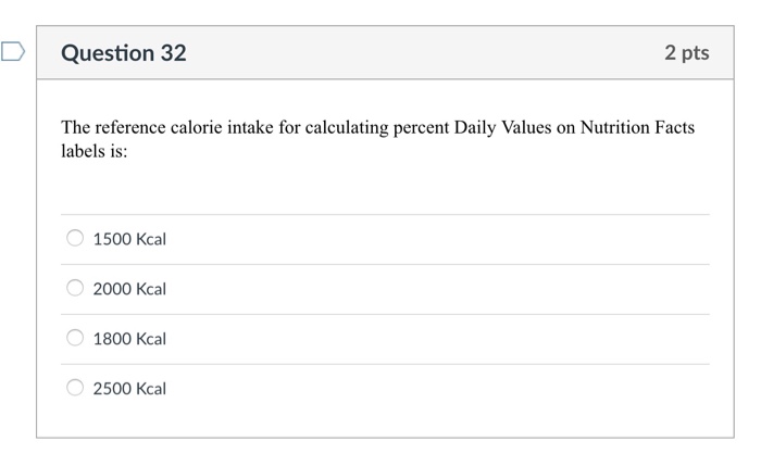 HNF Exam 1 (actual) Flashcards | Quizlet The reference calorie intake for calculating percent Daily Values on Nutrition Facts labels is A. 2300 kcal. B. 2000 kcal. C. 3000 kcal. D. 1500 kcal. b. 2000 Fats should fill what percentage of our daily caloric intake? A. 10-35%. B. 20-35%. C. 45-50%. D. 45-65% b. 20-35% Reading food labels helps consumers Daily Intake - Information within the Nutrition Facts table - Food ... The Daily Value (DV) is the reference point upon which the % Daily Value is based. The Daily Values are also used to set criteria for the nutrient content claims for vitamins and mineral nutrients. The Daily Value is the quantity applicable to a nutrient according to the Table of Daily Values [B.01.001 (1), B.01.001.1 (2), FDR ]. Week 2 Quiz.docx - The reference calorie intake for calculating percent ... The reference calorie intake for calculating percent Daily Values on Nutrition Facts labels is ________. 1. 2000 kcal 2. 2300 kcal 3. 1500 kcal 4. 3000 kcal 1 . 2000 kcal Question Points: 1.0 / 1.0 2 Bt corn contains a protein produced by a bacterial gene. This protein ________. 1. Reference Values for Nutrition Labeling (Based on a 2000 Calorie Intake; for Adults and Children 4 or More Years of Age) Food Component Unit of Measure Daily Values Fat grams (g) 78 Saturated Fat grams (g) 20 Cholesterol milligrams (mg) 300 Total Carbohydrate grams (g) 275 Sodium milligrams (mg) 2,300 Dietary Fiber grams (g) 28 Protein grams (g) 50 Added Sug